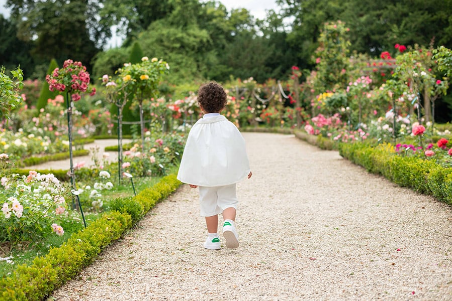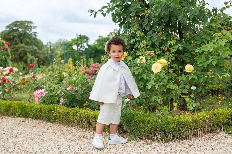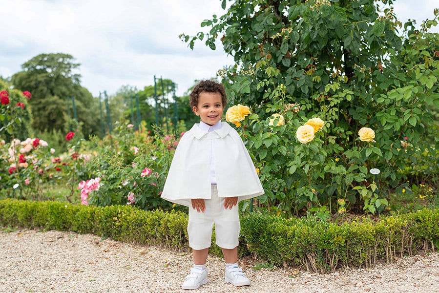 Cette cape complète parfaitement la tenue "Oscar" de notre collection, composée de vêtements assortis en coton blanc cassé clair (bermuda, pantalon, chemise, gilet de cérémonie et bonnet). Pour une tenue harmonieuse, associez-la à des vêtements de baptême en blanc cassé.