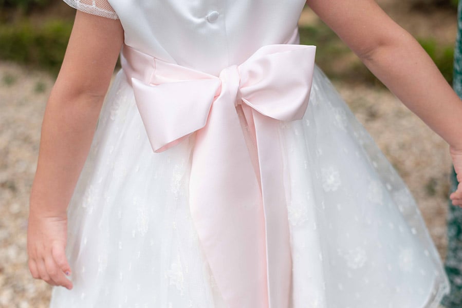 Il est possible de remplacer la ceinture blanc cassé par une ceinture en satin rose pâle, vert amande ou bleu ciel, selon le thème de votre événement.