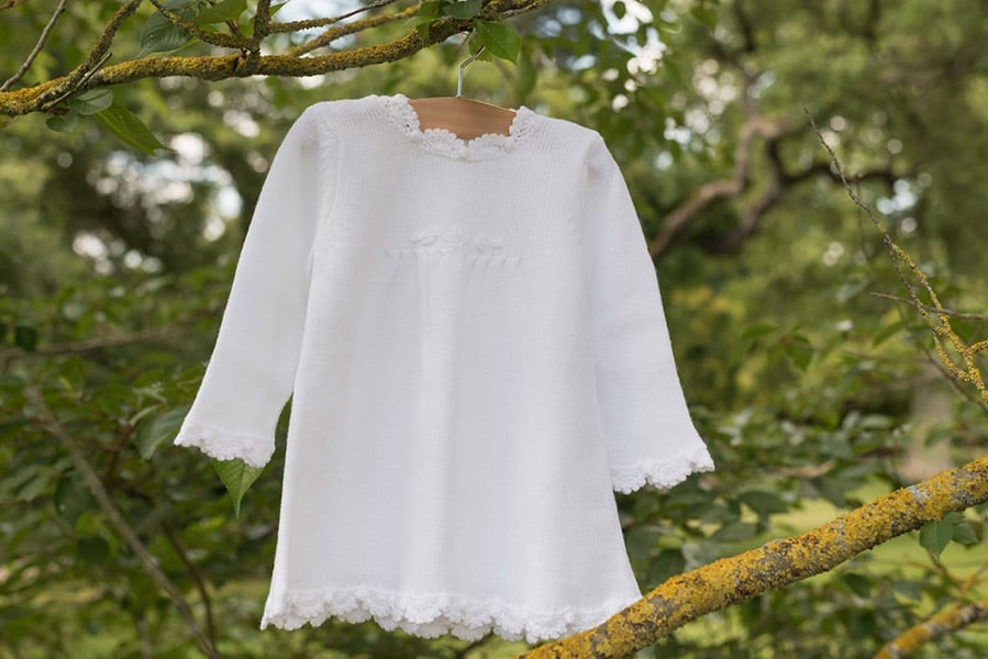 Voici une jolie robe de baptême en maille avec de la laine, parfaite pour les saisons fraîches comme l’automne, l’hiver, ou les printemps un peu frais.