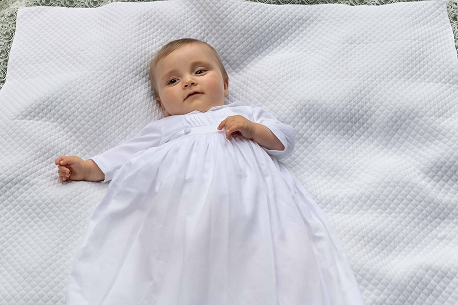 Découvrez la robe de baptême longue pour bébé garçon en piqué de coton blanc, ornée de dentelle de coton. Ce modèle raffiné combine confort et élégance pour un baptême inoubliable.