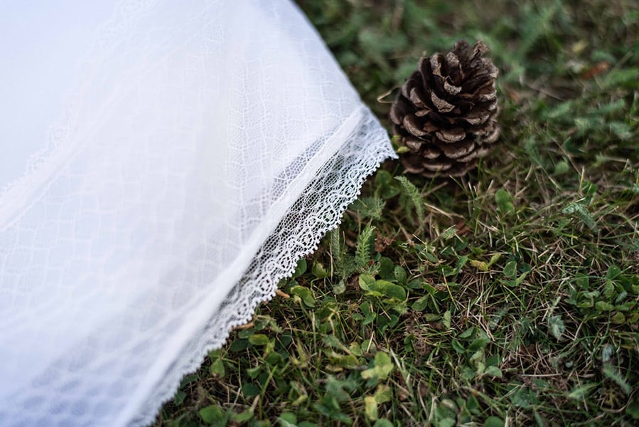 L'organza de soie utilisé sur cette robe provient d'Italie et la dentelle est française.