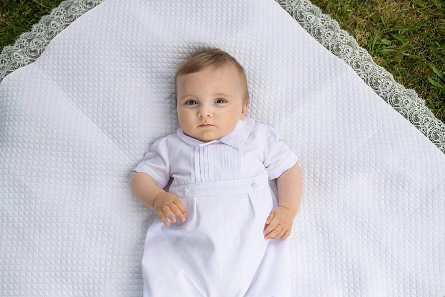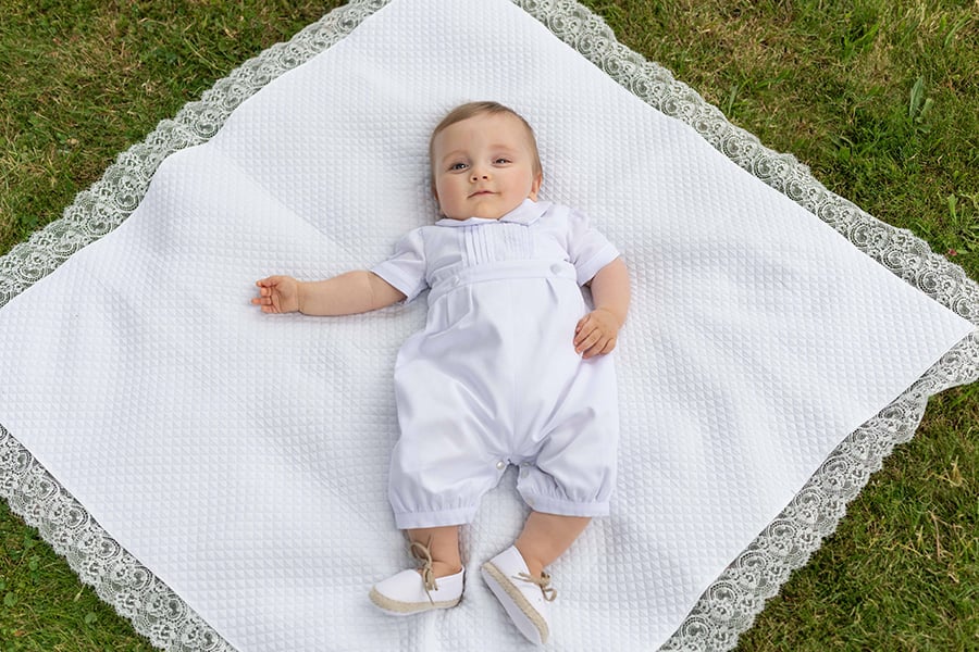Découvrez notre élégante barboteuse de baptême pour bébé garçon, parfaite pour l'été. Confectionnée en piqué de coton blanc, cette tenue légère assure un confort optimal à votre enfant. Dotée de manches courtes, la barboteuse est idéale pour les cérémonies estivales ou printanières. Le corsage est orné d'un petit col pointu et de plis décoratifs entrelacés de galons de dentelle de coton, apportant une touche raffinée à la tenue.