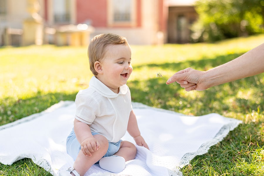 La chemise, confectionnée dans un lin doux et respirant, se distingue par ses délicates broderies et ses finitions soignées. Elle se ferme dans le dos à l’aide de petits boutons, facilitant l’habillage tout en apportant une touche d’élégance. Le short, en coton léger se fixe à la chemise par de petits boutons discrets pour un maintien optimal, même lorsque bébé bouge.