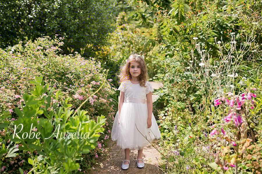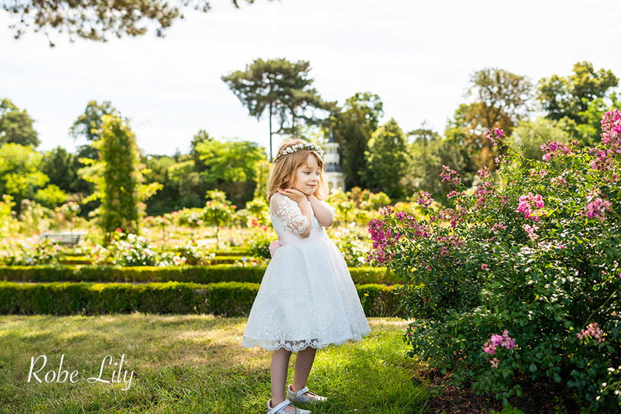 La dentelle apporte aux robes de cérémonie pour petites filles une touche de délicatesse et d'élégance. Que ce soit pour les robes de demoiselles d'honneur, les robes de communion ou de baptême, nous vous proposons une collection de robes avec des touches de dentelle sur les manches, le corsage ou la jupe. La dentelle que nous utilisons est de grande qualité et provient de fabricants français, italiens ou espagnols.