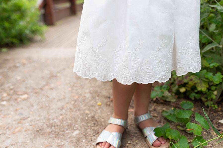 Les manches courtes sont brodées d'un joli motif floral ainsi que la bas de la robe.