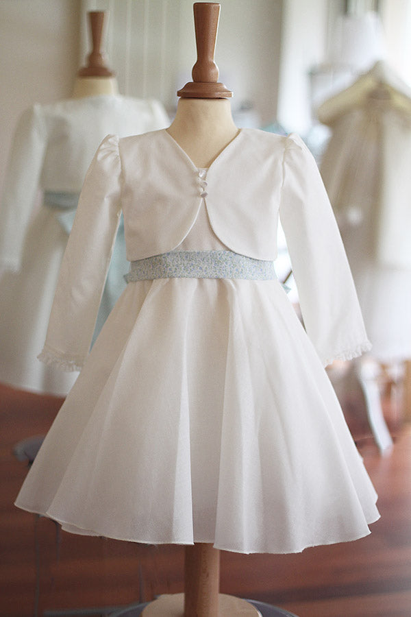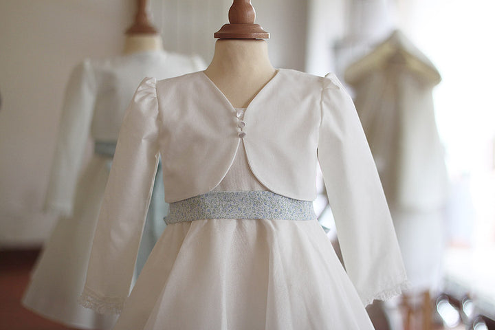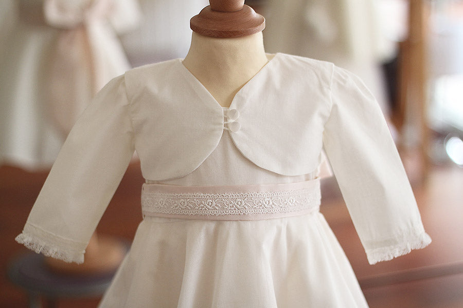 Ce boléro de cérémonie pour bébés et enfants, confectionné en coton blanc cassé, est le complément parfait pour les grandes occasions. Conçu pour être porté avec la robe en coton Juliette, il forme un ensemble harmonieux et chic. Le bas des manches longues est délicatement bordé d’un galon de dentelle, ajoutant une touche de raffinement.