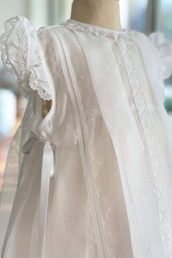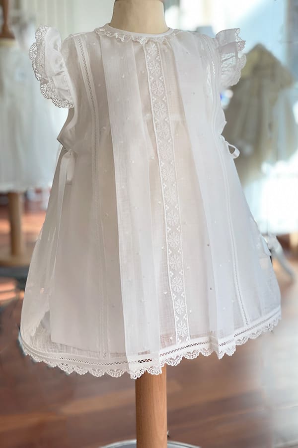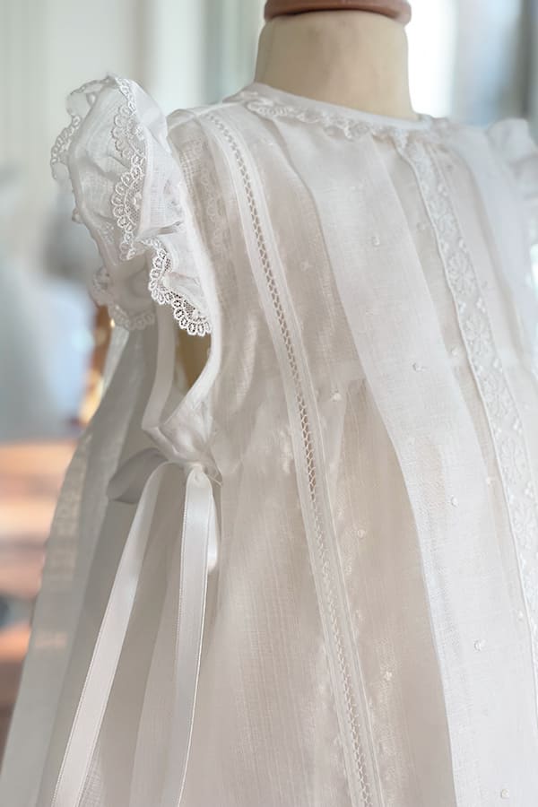Pratique et élégante, cette robe de baptême se ferme par de petits boutons dans le dos, facilitant l'habillage. Légère et confortable, elle est parfaite pour un baptême d'été, une cérémonie religieuse ou une occasion spéciale.