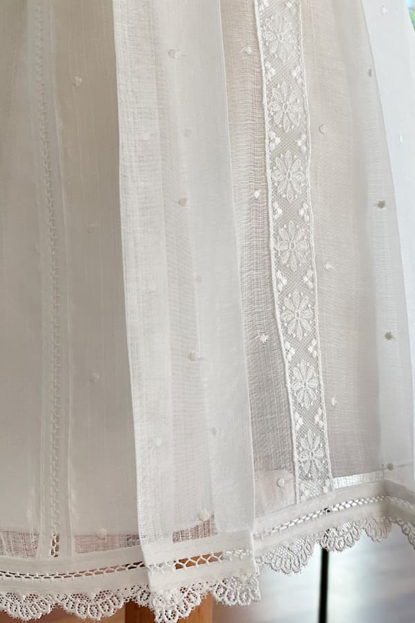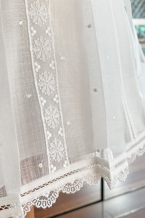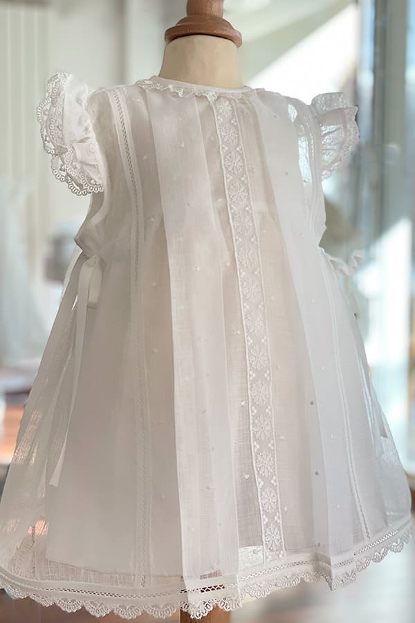 La robe se compose d'une sous-robe en coton blanc cassé, douce et respirante, et d'une sur-robe en mousseline délicate ornée de galons de dentelle fine. Le devant est sublimé par de larges plis élégants, alternant mousseline et galons de dentelle, qui apportent du relief et une touche de raffinement à l'ensemble.