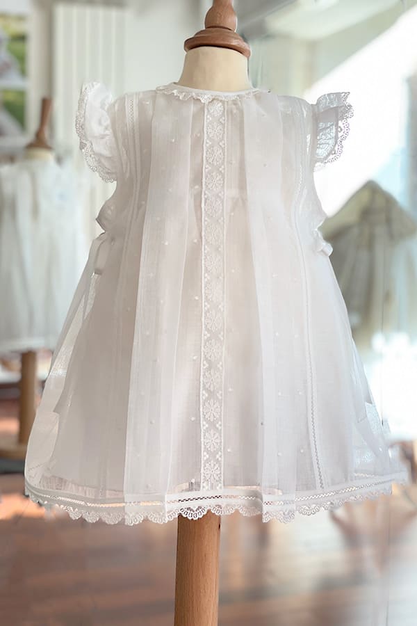 Découvrez cette ravissante robe de baptême pour bébé fille , idéale pour une cérémonie estivale pleine de douceur et d'élégance. Confectionnée dans une mousseline plumetis blanc cassé, cette robe de baptême adopte une coupe trapèze confortable et aérienne, adaptée parfaitement aux tout-petits.