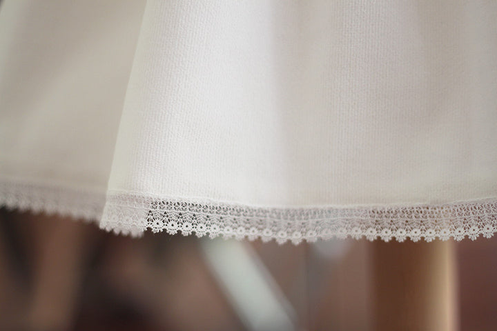Les détails de cette robe ne s’arrêtent pas là : les manches et le bas de la jupe sont également bordés d’un galon de dentelle délicat, offrant une apparence harmonieuse.