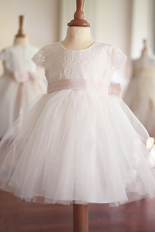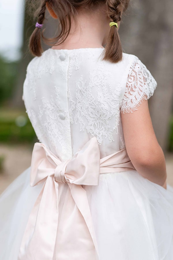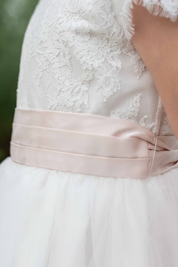 Le corsage de la robe est orné de délicates manches courtes en dentelle italienne, apportant une touche de raffinement. La jupe, également en tulle, est doublée de coton pour un rendu léger et aérien, tout en restant confortable. La ceinture trois plis, nouée dans le dos, est réalisée en satin rose poudré, offrant une finition élégante.